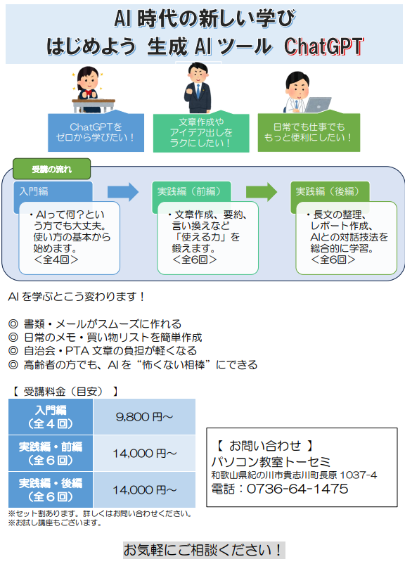 教室案内 自分の都合に合わせて好きな曜日、好きな時間に予約を入れて受講できます。 オリジナルテキストも、とても分かりやすいので、自宅で楽しく復習できます。一人でパソコンの勉強をするのは不安という方、ワイワイ楽しく学べるパソコン教室トーセミにいらっしゃいませ。 電話で申し込みの方はこちら 無料体験お申込みの方はこちら メールでお申込みはこちら 問い合わせフォーム 貴志川教室時間割です トーセミ公式ライン登録者特典として 無料体験受講生にテキスト一冊進呈